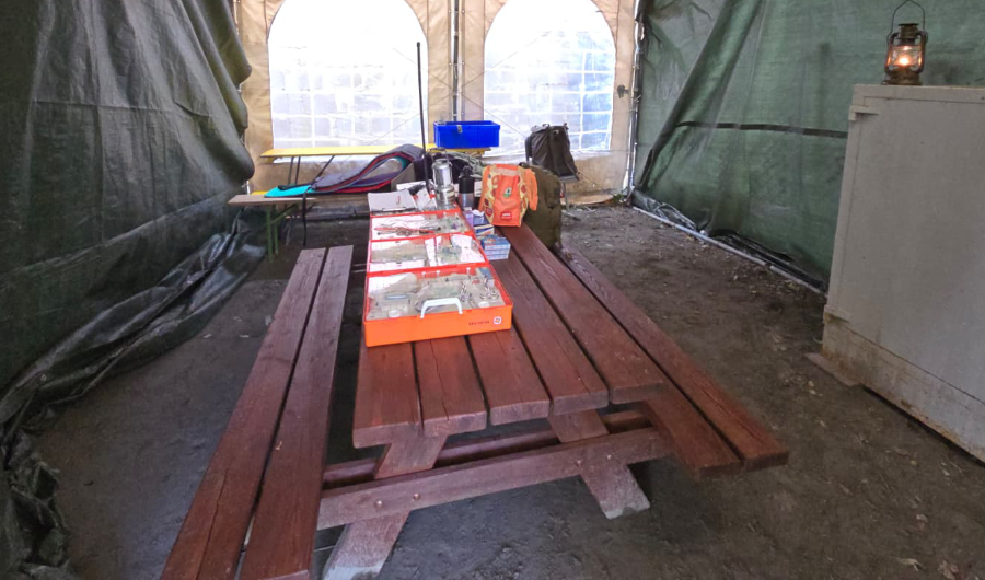 Es wurde bei strahlendem Sonnenschein mit guter Laune gemeinsam mit Gebet und Gesang in die Arbeit gestartet. Die Teamleiter hatten eigene Aufgabengebiete vorbereitet, die sie mit den zugeteilten Helfern angingen. So wurden unsere Holztische geputzt, geschliffen und neu lasiert, der Hackbereich aufgeräumt und neugestaltet, Holz gestapelt sowie unsere Campzelte aufgebaut und auf Beschädigungen untersucht.